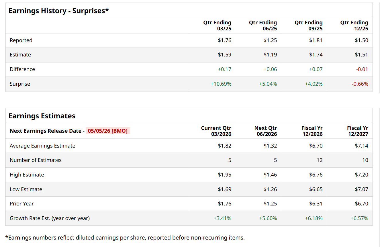 Ahead of this event, analysts expect this utility company to report a profit of $1.82 per share, up 3.4% from $1.76 per share in the year-ago quarter. The company has topped Wall Street’s earnings estimates in three of the last four quarters, while missing on another occasion. In Q4 2025, DUK’s EPS of $1.50 fell short of the consensus expectations by a slight margin.