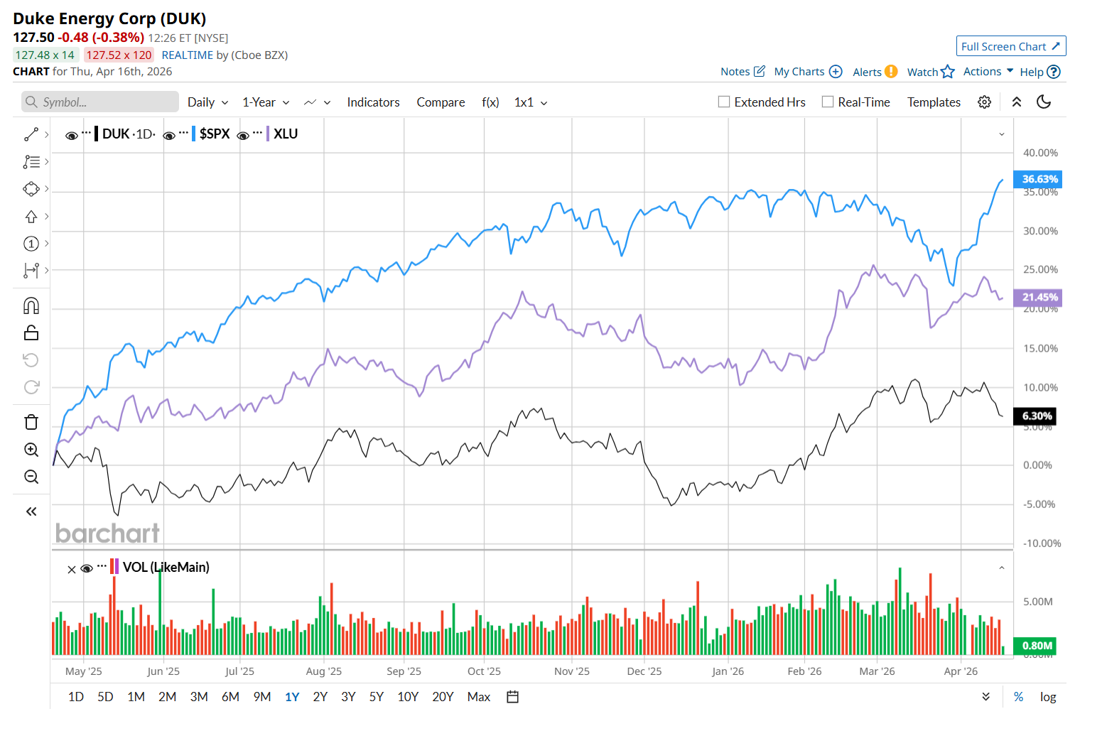 DUK has gained 6.2% over the past 52 weeks, considerably trailing both the S&P 500 Index's ($SPX) 30.1% return and the State Street Utilities Select Sector SPDR ETF’s (XLU) 19.8% uptick over the same time period.