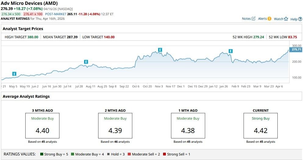 The consensus rating on Advanced Micro Devices sits at “Strong Buy” currently, with price targets as high as $380, indicating potential upside of more than 35% from here.