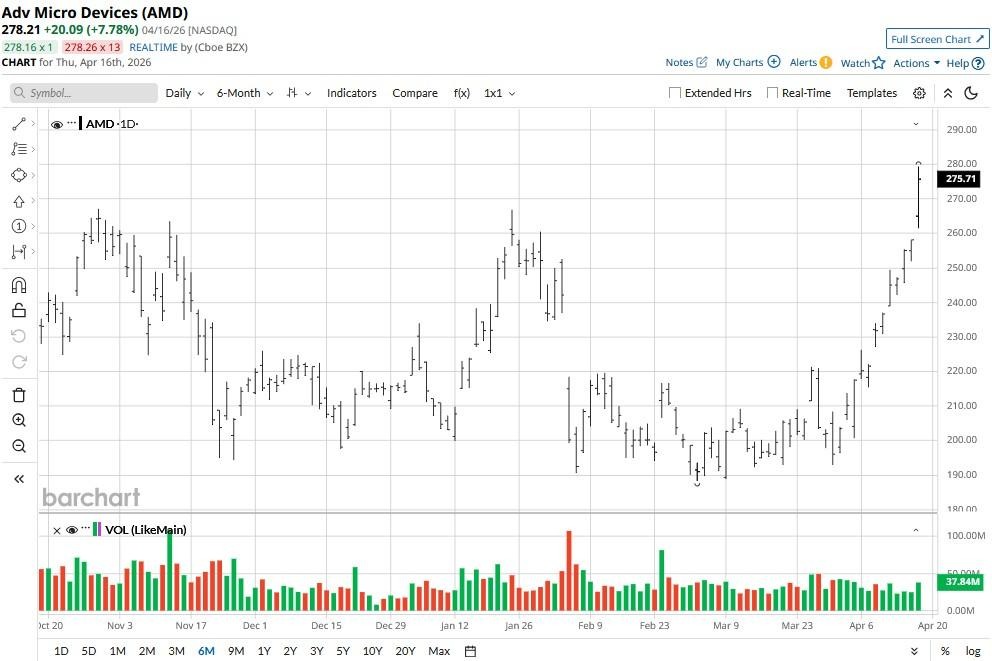 Advanced Micro Devices (AMD) shares are extending gains on Thursday morning amid a broader sector-wide rally on positive spillover from Taiwan Semiconductor’s (TSM) strong Q1 earnings.