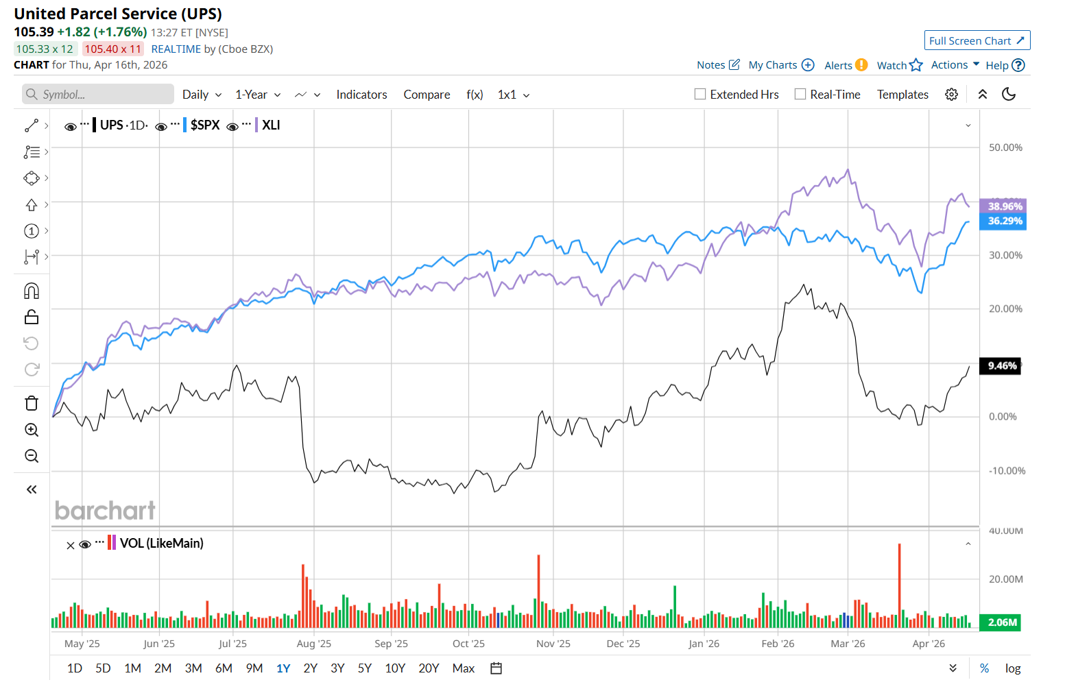 UPS has gained 11.8% over the past 52 weeks, considerably underperforming both the S&P 500 Index's ($SPX) 30.1% return and the State Street Industrial Select Sector SPDR ETF’s (XLI) 37.4% uptick over the same time period.