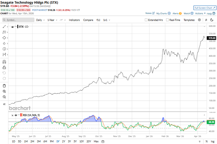 Over the past 52 weeks, Seagate’s stock has gained a whopping 612.96%, while it is up 129.69% over the past six months. Moreover, this year, the stock is up 88.52%. Seagate’s shares reached a 52-week high of $534.23 on Apr. 14, and are down only 2.2% from that level.