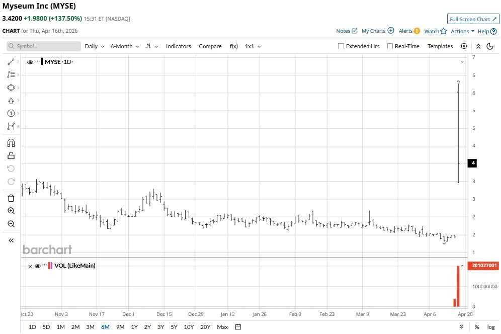 At its intraday peak, Myseum stock was seen trading at nearly $5.50, more than 4x its price on April 10.