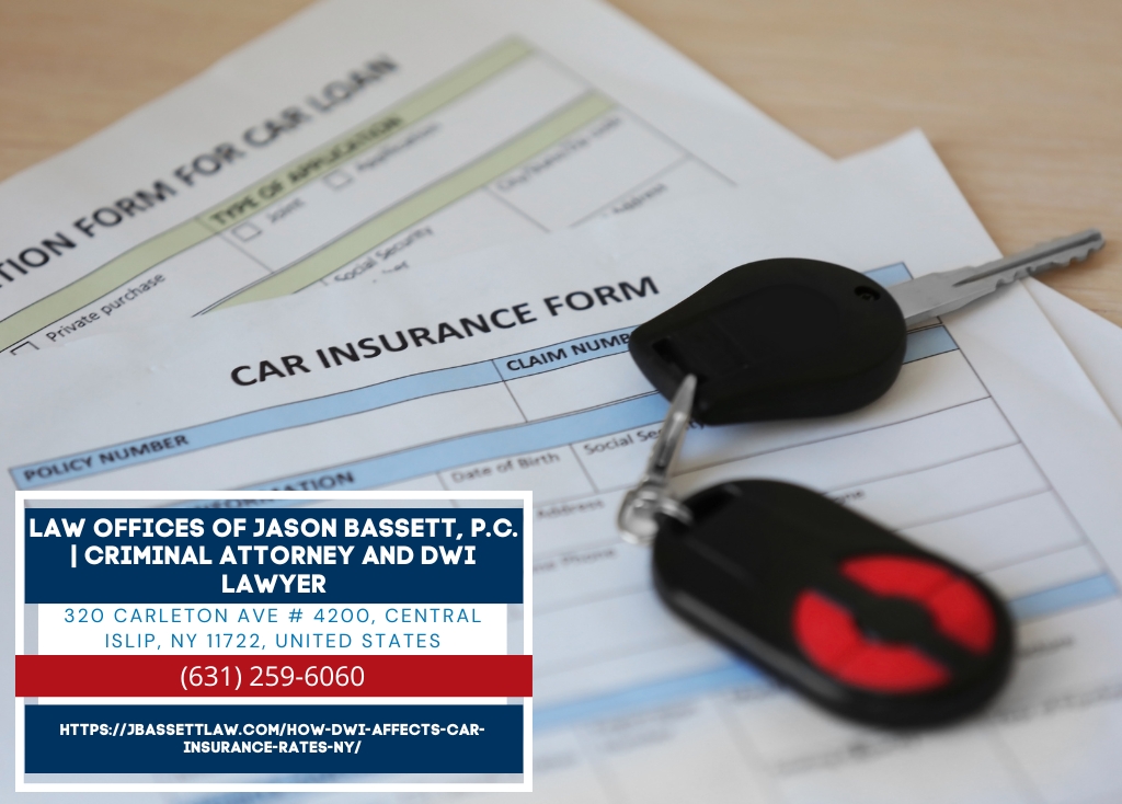 CENTRAL ISLIP, NY - A Driving While Intoxicated conviction in New York can increase car insurance premiums by 50 percent or more, with some drivers facing rate hikes that persist for several years after the criminal case is resolved. Suffolk County DWI defense attorney Jason Bassett of the Law Offices of Jason Bassett, P.C. (https://jbassettlaw.com/how-dwi-affects-car-insurance-rates-ny/) is explaining how a DWI conviction impacts insurance costs in Suffolk County and across Long Island, how long elevated rates typically last, what options exist for high-risk drivers, and what steps can be taken to reduce premiums over time.