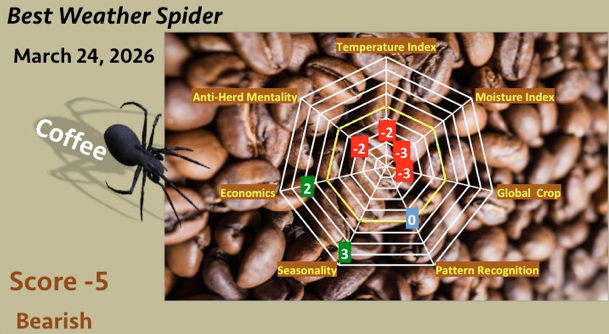 More than 6 months ago, I put out a very bearish (-8) Weather Spider score and coffee prices collapsed from $3.50 to $2.80 a few weeks ago. This was because of the weakening La Niña event I predicted last fall and that usually “excellent summer (Brazil) weather”.