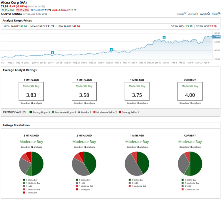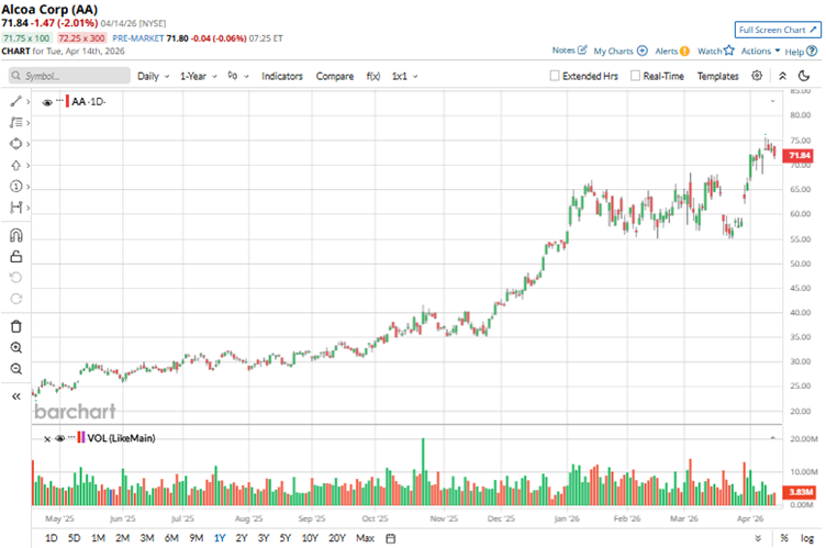 The disruptions due to the Iran war have cut global aluminum supply, spiking prices and benefiting Alcoa's upstream model, which integrates bauxite and alumina production. Over the past 52 weeks, AA stock has gained 186%, while shares are up 35% year-to-date (YTD). AA stock reached a 52-week high of $75.70 on April 9, but after declining 2% over the past five days, shares are down 13% from that level.