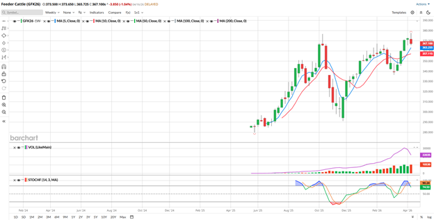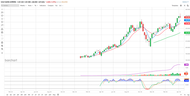 Today, June Live Cattle closed at 247.625, down 3.450 on the day. New contract, and all-time highs were set in Live Cattle futures on Tuesday this week, but the Doji on Wednesday and the bearish push today has changed the short-term outlook, in my opinion. Feeders also set new contract highs, but did not reach the all-time highs. Scroll down to see the weekly charts for both Live and Feeder Cattle.