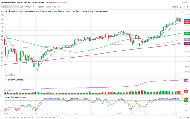 If you look at the chart above, you may notice a few things. Today’s settlement marks the first time that June Fats have closed below the 10-day moving average (red, 248.012) in about a month, March 13th to be precise. It’s been touched/tested a few times, since then, but has held as support. The past three sessions have posted what some may consider an “Evening Star” pattern, which is usually a sign of trend reversal. New highs and a very bullish day on Tuesday, followed by a Doji or equilibrium day on Wednesday and then a bearish breakdown today which set new lows for the week. That doesn’t seem very friendly or bullish to my eye. The 5-day moving average (blue) is now offering potential resistance at 249.570. The 50-day (green, 237.190), the 100-day (grey, 231.014) and the 200-day (purple, 227.566) are all still inclined higher and offering potential support levels. Stochastics (bottom sub-graph) are starting to turn down, out of an overbought condition, as well.