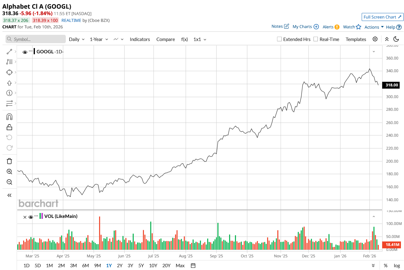 Barchart's internal data shows an overall consensus opinion of "Strong Buy" for GOOGL stock, based on the opinion of 55 analysts. It breaks down as follows: 46 rate GOOGL a "Strong Buy," three a "Moderate Buy," and six say "Hold." There are no "Sell" ratings. The strong buy signal aligns with broader market sentiment, reflecting Alphabet's Q4 earnings beat and cloud growth.