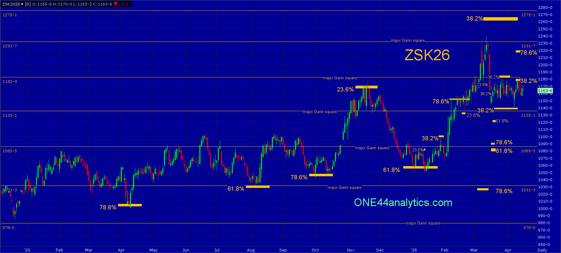 The rally after holding 38.2% at 1139.00 hit the short term target area of 38.2% back to the 3/12/26 high at 1177.50 and the 1182.50 major Gann square. The longer term trend remains positive above 1139.00, however the short term downtrend from the 3/12/26 high is still negative until it can take out 38.2% at 1177.50 and this will be the key level for the week.