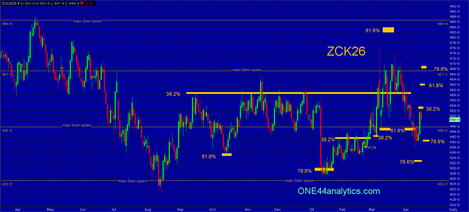 Below it, keeps the short term trend negative and a new low is possible. The short term target is 78.6% back to the 4/10/26 low at 441.00, a failure to make a new low in this area can be the start of the next leg up, per the ONE44 78.6% rule. The long term target is 78.6% back to the contract low at 433.00, a failure to turn higher from this area will give us only major Gann squares to look for support and then use as the swing point when closed below, the next two are 425.25 and 406.50.