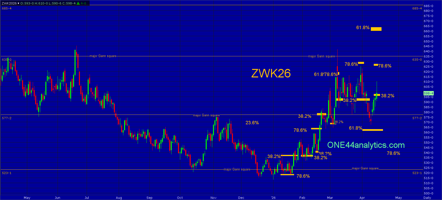 Below it, the short term trend is 61.8% back to the contract low at 563.00. The long term target is 78.6% of the same move at 541.50. A failure to turn higher from this area will give us only major Gann squares to look for support and then use as the swing point when closed below, the next one is 523.00.