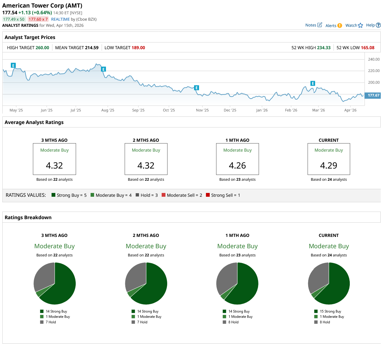 Across 24 analysts, AMT carries a “Moderate Buy” consensus, with an average price target of $214.59, implying an upside of roughly 22% from current levels.