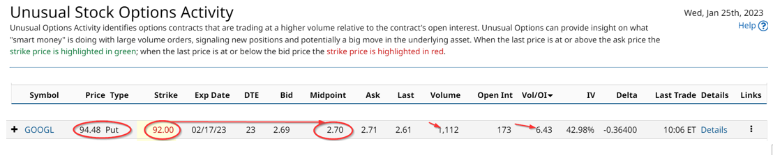 It shows that the Feb. 17 put options for the $92 strike price have experienced a large volume. This strike price has 1,112 put contracts traded today, which is 6.4x the 173 in open interest or existing contracts outstanding.