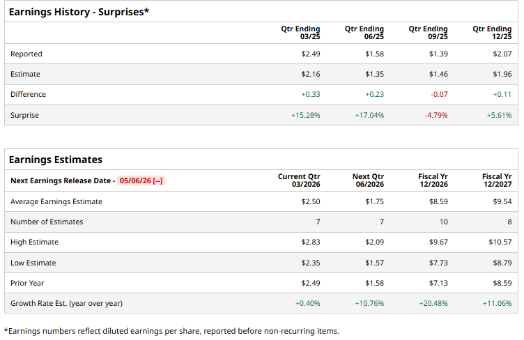 The company is expected to release its Q1 2026 earnings soon. Ahead of the event, analysts expect the company to generate a profit of $2.50 per share on a diluted basis, up marginally from $2.49 per share in the year-ago quarter. The company has surpassed Wall Street’s EPS estimates in three of its last four quarters, while missing on one occasion.