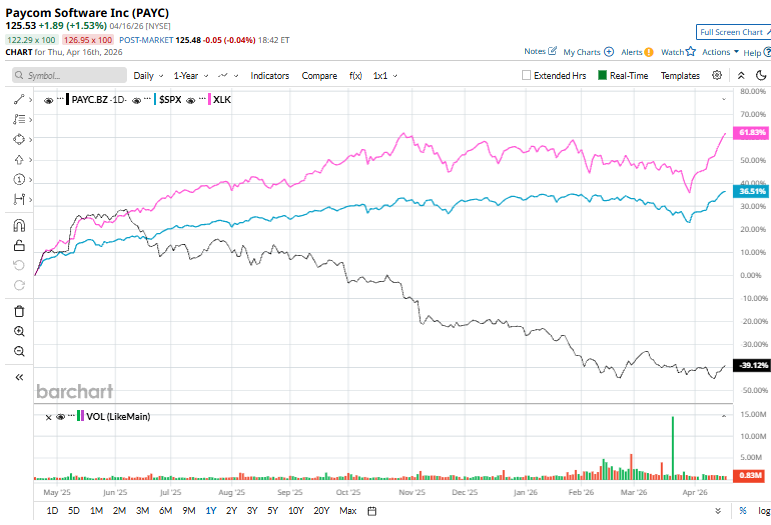 Shares of PAYC have declined 21.6% over the past 52 weeks, underperforming the S&P 500 Index’s ($SPX) 19.3% rise and the Technology Select Sector SPDR ETF’s (XLK) 29% return during the same time frame.