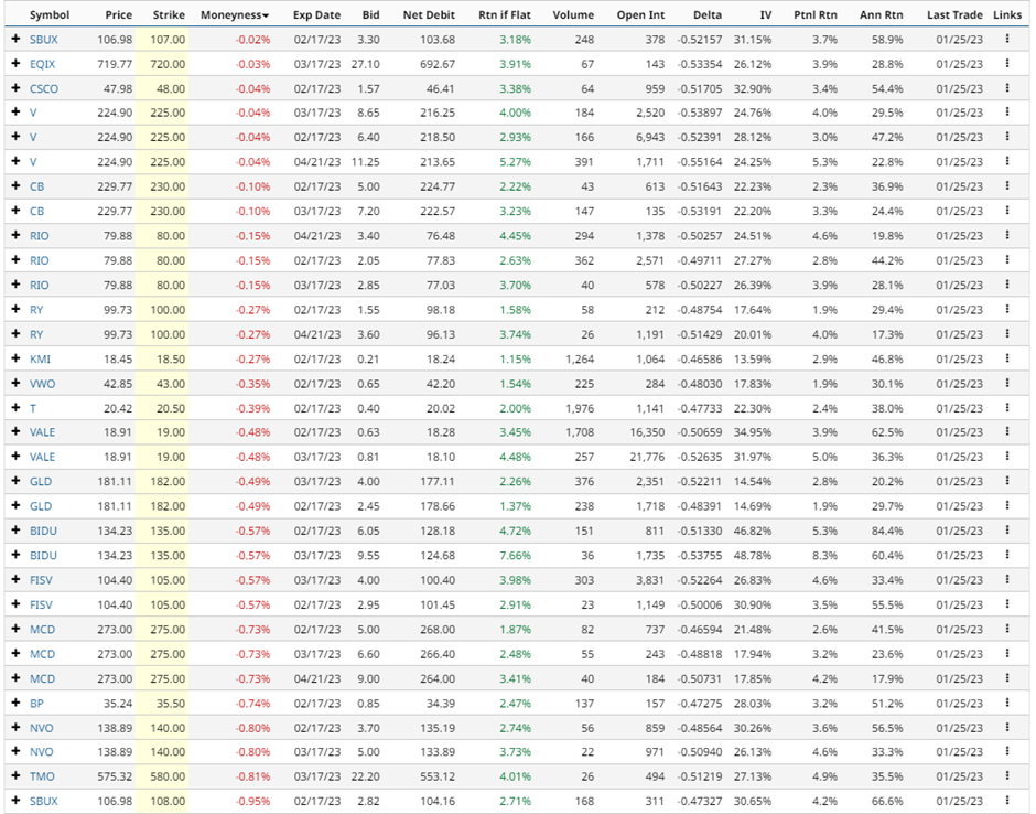 Let’s add a filter for Market Cap over 40 billion and 60-month Beta below 1.00. We’ll also change the Moneyness filter from -25% to 0% and add a 50% Buy rating criteria.