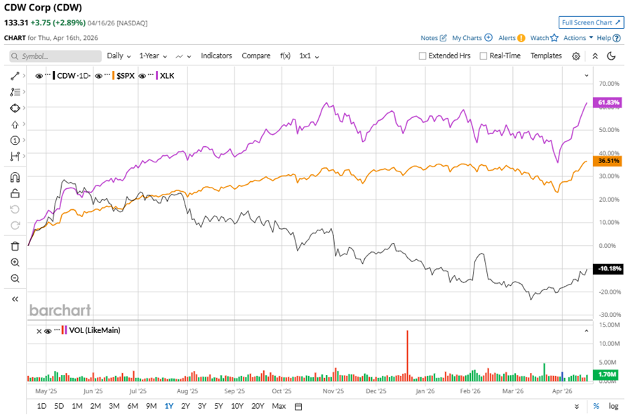 CDW stock has underperformed the S&P 500 Index’s ($SPX) 33.5% gains over the past 52 weeks, with shares down 10.4% during this period. Similarly, it notably underperformed the State Street Technology Select Sector SPDR ETF’s (XLK) 56.8% gains over the same time frame.