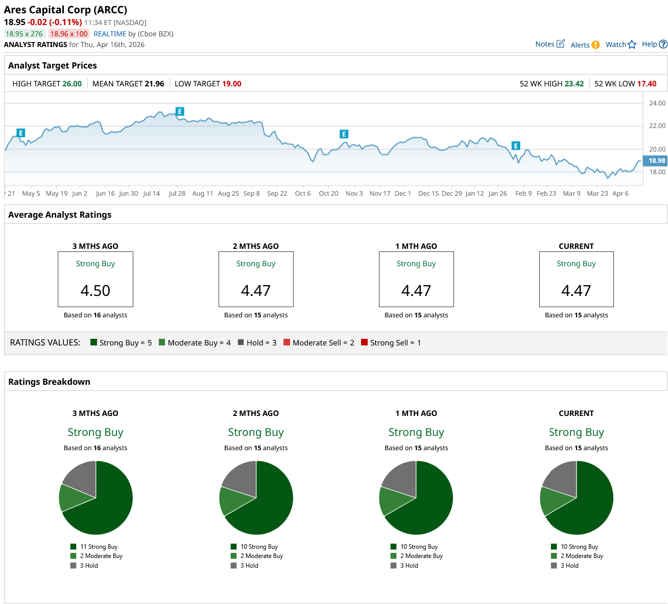 Overall, Wall Street says ARCC stock is a “Strong Buy.” Of the 15 analysts covering the stock, 10 rate it a “Strong Buy,” two rate it as a “Moderate Buy,” and three rate it a “Hold.”