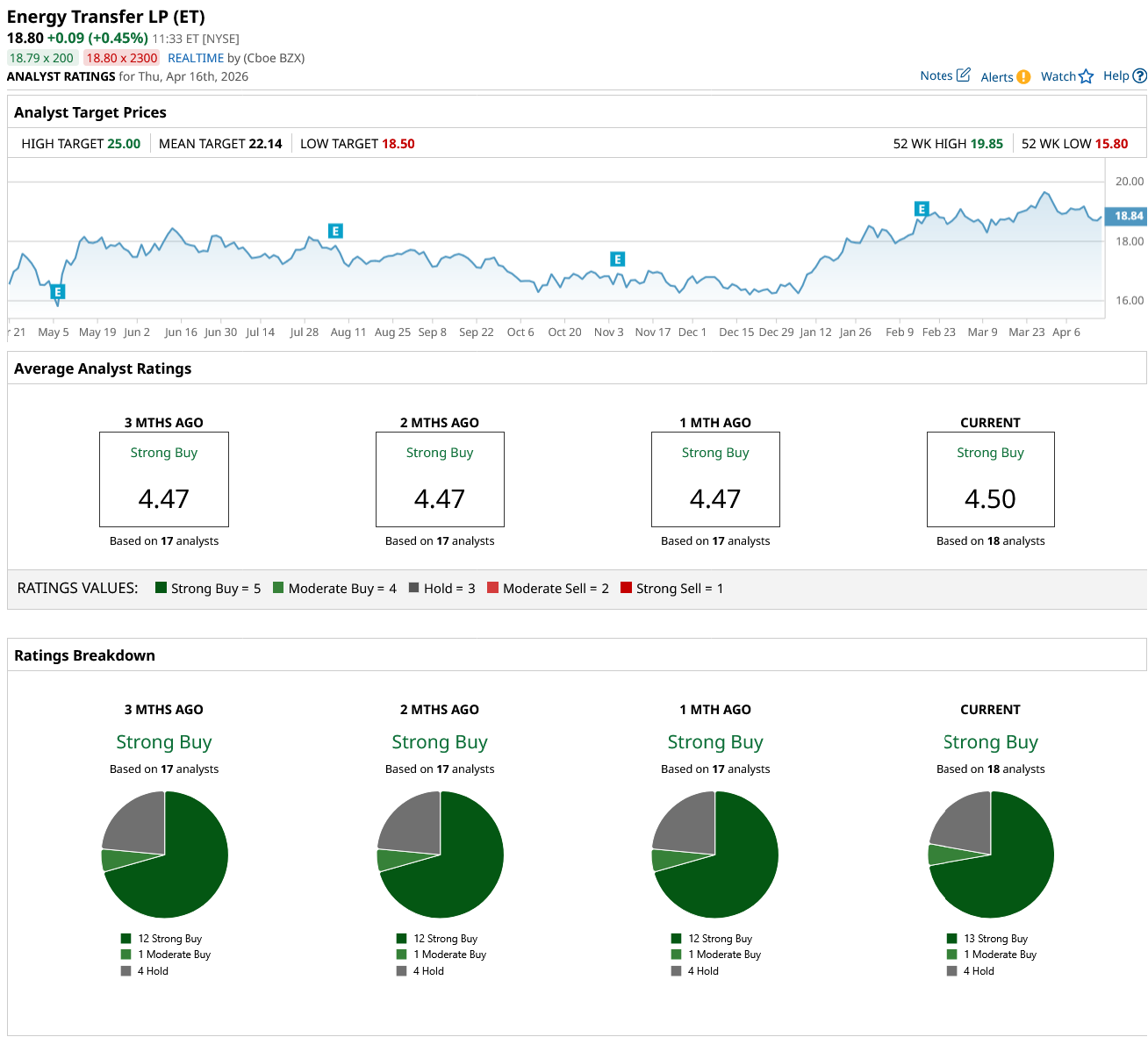 Overall, Wall Street says ET stock is a “Strong Buy.” Of the 18 analysts covering the stock, 13 rate it a “Strong Buy,” one rates it as a “Moderate Buy,” and four say it is a “Hold.”