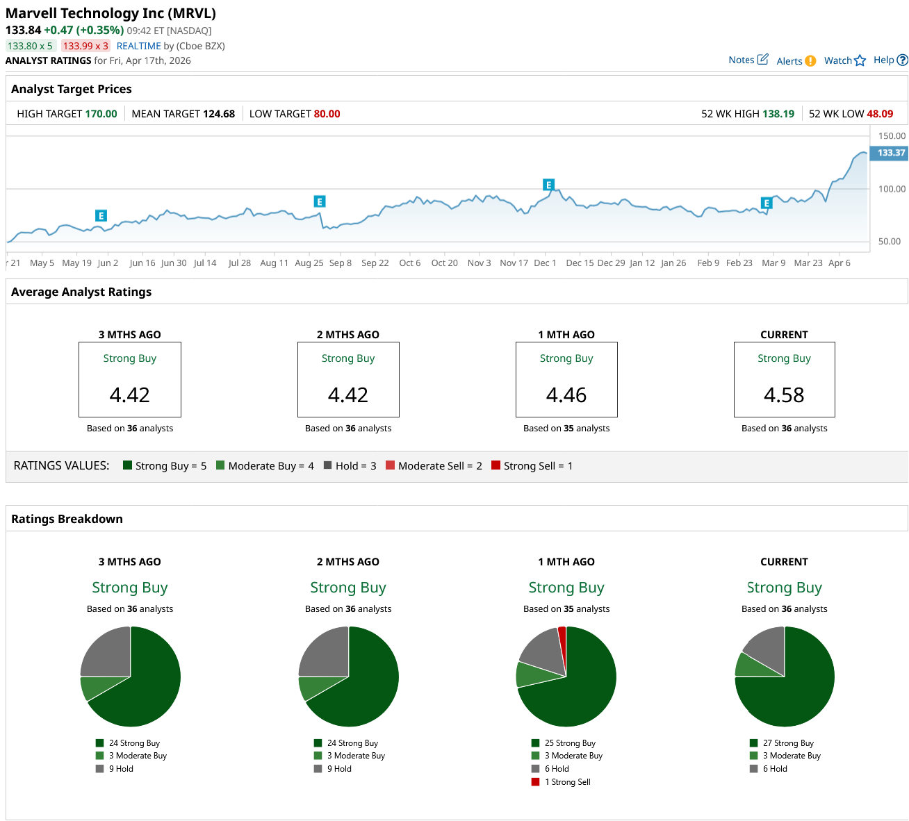 Despite the price surge, MRVL stock maintains a consensus "Strong Buy" rating, supported by 27 "Strong Buy" and three "Moderate Buy" designations. While the mean price target of $124.68 technically reflects a 7% downside, this is largely due to analysts’ models playing catch-up with the stock’s rapid vertical ascent.