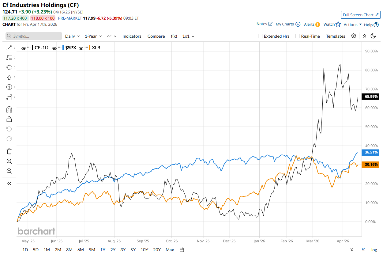 On Apr. 16, CF stock rose 3.2% amid concerns that the US blockade of the Strait of Hormuz would disrupt global fertilizer supplies. Fertilizer costs have gone up by nearly 50% in some markets, ever since the start of the Iran war. Due to disruptions in the supply chain, farmers and corporations are facing a lack of supply in ammonia and nitrogen-based fertilizers, or higher prices, potentially leading to a surge in food prices for consumers and exacerbating food insecurity around the world, according to analysts.