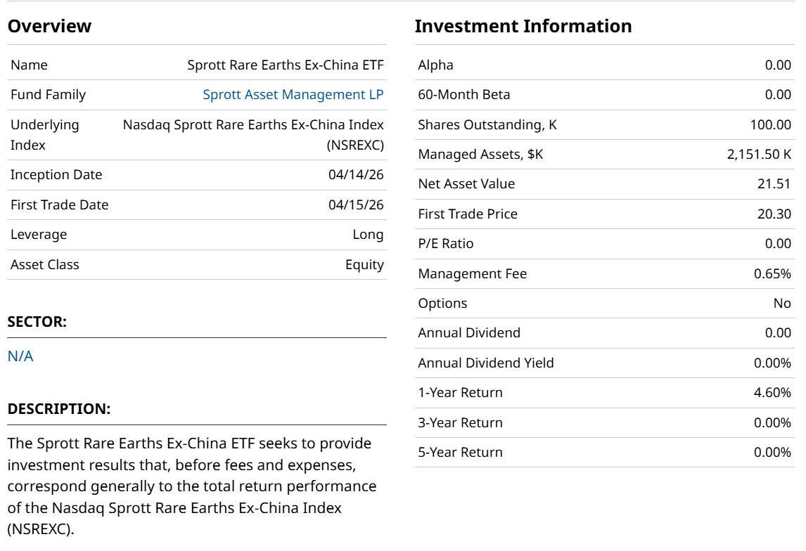 REXC debuted on Tuesday, so it currently has a mere $2 million in assets. But given that the Vaneck Rare Earth Strategic Metals ETF (REMX) is about the only peer in existence, REXC has at least attempted to do something unique.