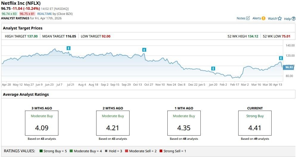 The consensus rating on Netflix also sits at a “Strong Buy” with the mean price target of roughly $116, indicating potential upside of nearly 20% from here.