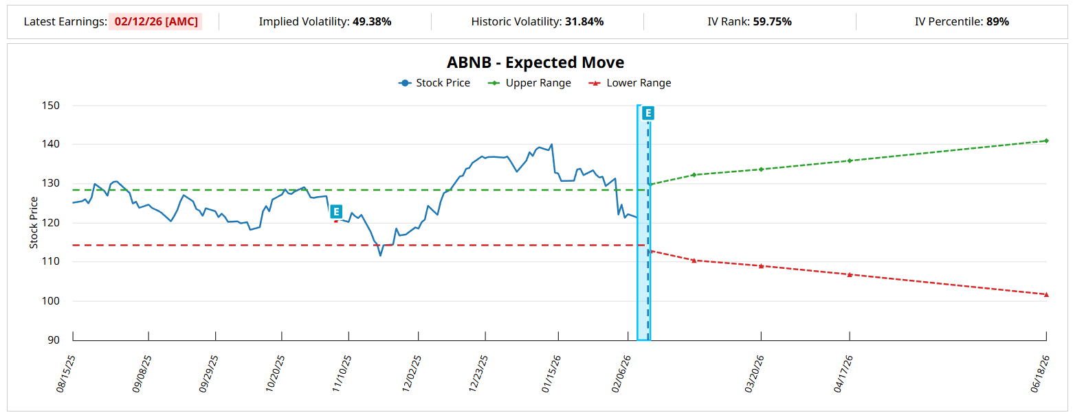 While we now have a general understanding of smart money sentiments toward ABNB stock, we’re still at a loss as to how this may actually translate into price outcomes. For that, we may turn to the Black-Scholes-derived Expected Move calculator. Wall Street’s standard mechanism for pricing options reveals that for the Feb. 13 expiration date, ABNB may land between $112.85 and $129.77.