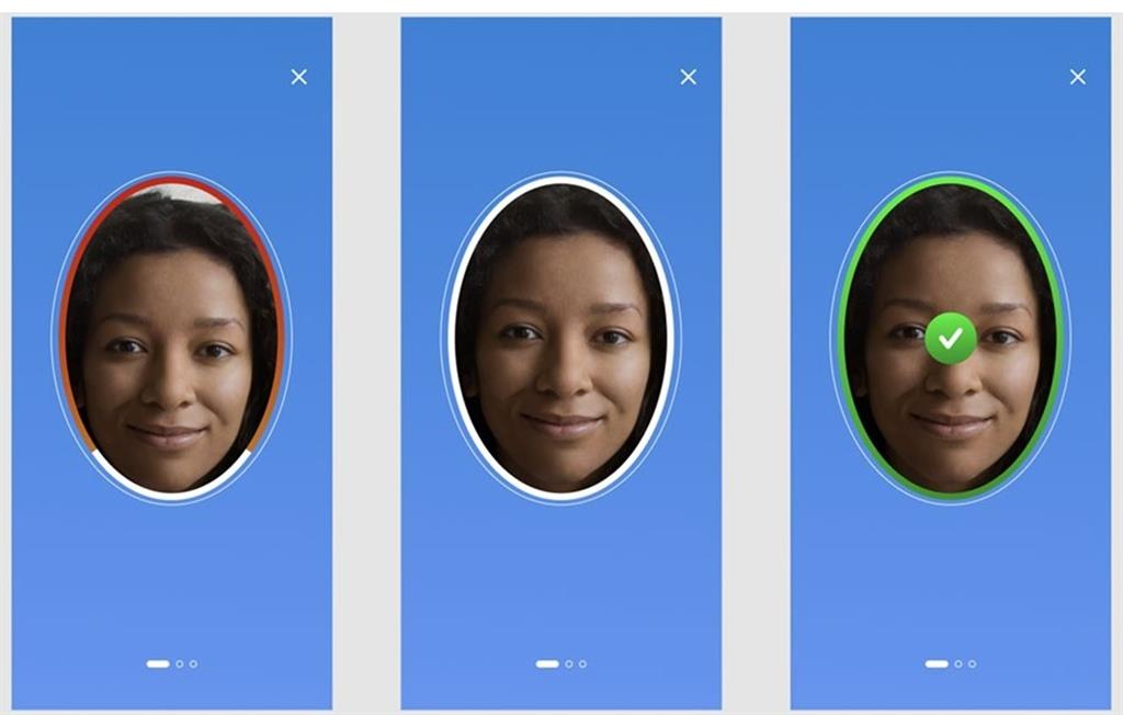 The user authenticates using a facial scan that includes AI-based liveness detection to ensure the presence of a real person rather than a static image or replayed video.