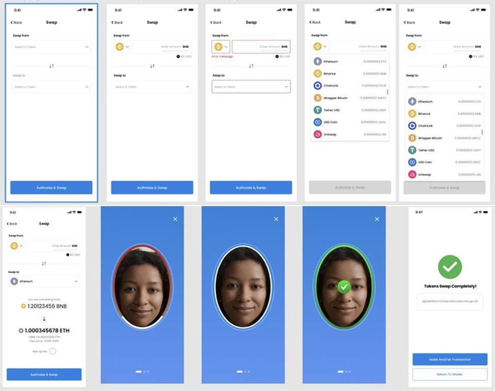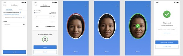 Below images (meant for illustrative purposes only) show the biometric verification flow used to authorize wallet access and transactions. Users simply look at their device camera and complete a brief liveness verification sequence. Once verified, the system generates the cryptographic key needed to sign the transaction.