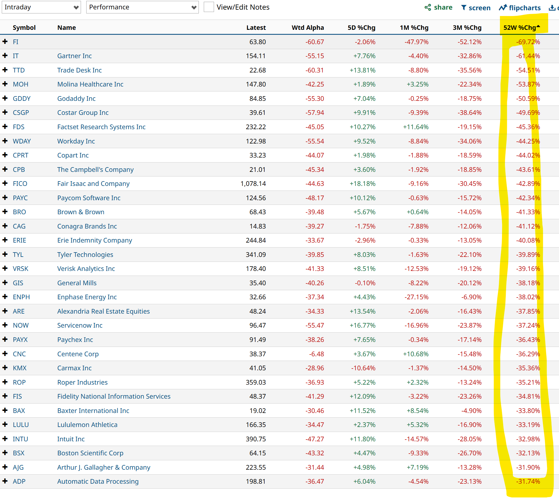 - Roughly 20% of the index is down more than 10%, and over 11% of the stocks are down more than 20% on a 52-week basis.