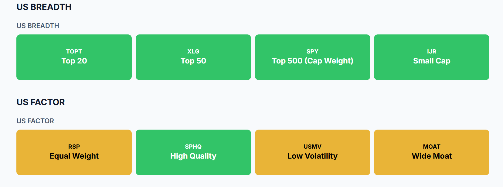 This ROAR Score analysis by market segment tells the story in living color. Look at the the top-heavy, cap-weighted ETFs on the top row, and the SPHQ High Quality ETF (SPHQ) that is one of those high-correlation funds to SPY. All green (lower risk). But RSP (RSP), low volatility (USMV) (USMV) and wide-moat stocks (MOAT) (MOAT), are all still in the neutral risk range. They have not yet bought in. Or put more properly, they continue to lag.