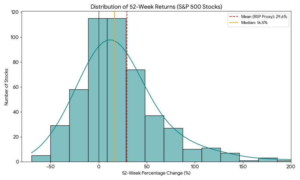 - While the average (mean) return of these stocks is 29.6% — a proxy for equal-weight performance (RSP) — the median return is just 16.5%. This 13% gap proves that the average result is being heavily inflated by a small group of super-performers.