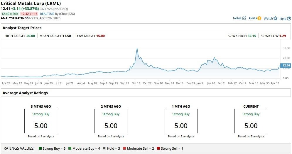 The consensus rating on Critical Metals remains at “Strong Buy," with the mean price objective of $17.5 indicating potential for a 35% rally from here.
