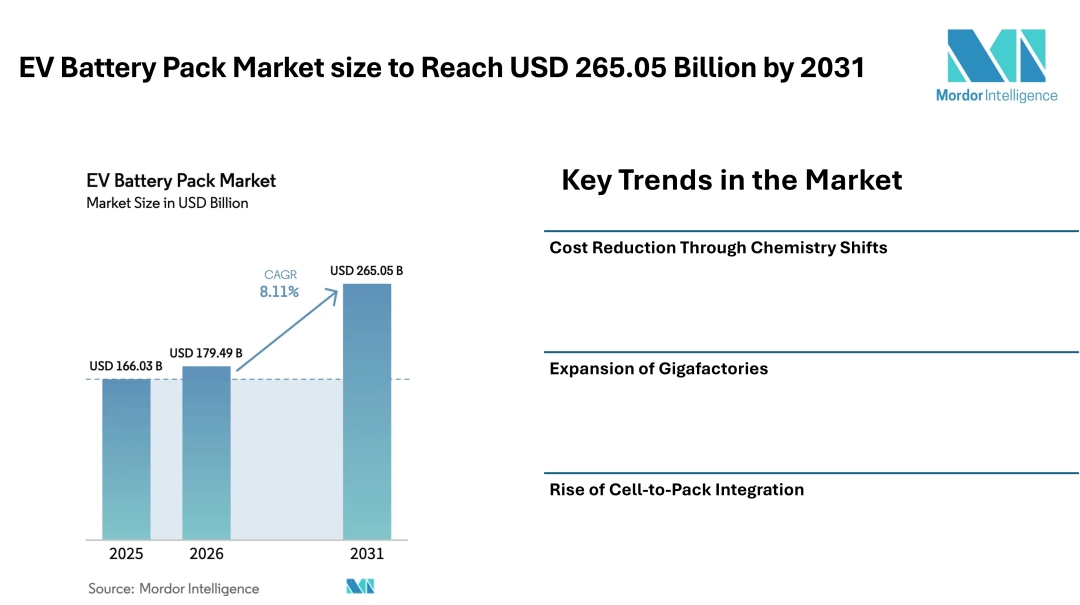 According to Mordor Intelligence, the EV battery pack market size is projected to grow from USD 166.03 billion in 2025 to USD 179.49 billion in 2026, and further reach USD 265.05 billion by 2031, registering a CAGR of 8.11% during the forecast period. This EV battery pack market growth reflects a steady rise in electric vehicle adoption across passenger and commercial segments, supported by declining battery costs and improvements in manufacturing scale.