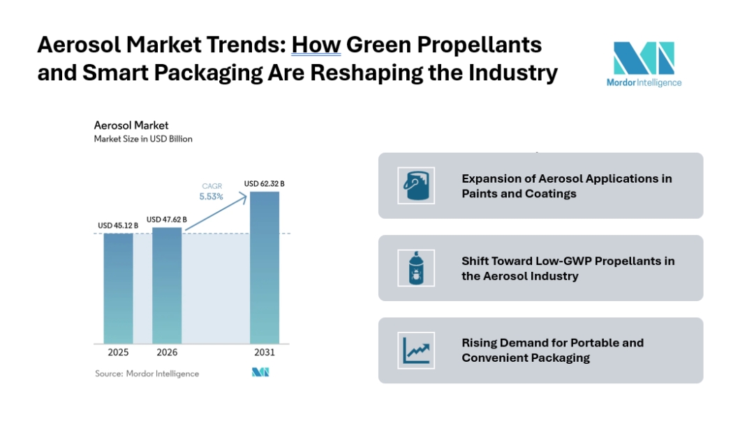 The Aerosol market continues to expand steadily as industries adopt convenient and efficient packaging solutions across personal care, healthcare, household, and industrial applications. According to recent analysis, the aerosol market size is projected to grow from USD 45.12 billion in 2025 to USD 47.62 billion in 2026, reaching USD 62.32 billion by 2031, at a CAGR of 5.53% during the forecast period.