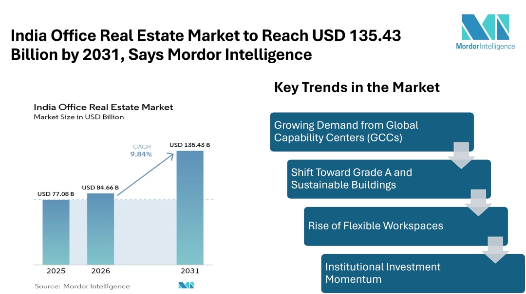 According to Mordor intelligence, the India office real estate market size in 2026 is estimated at USD 84.66 billion, growing from USD 77.08 billion in 2025, and is projected to reach USD 135.43 billion by 2031, growing at a CAGR of 9.84%. This growth reflects strong occupier confidence, rising institutional investments, and the increasing importance of modern office infrastructure.