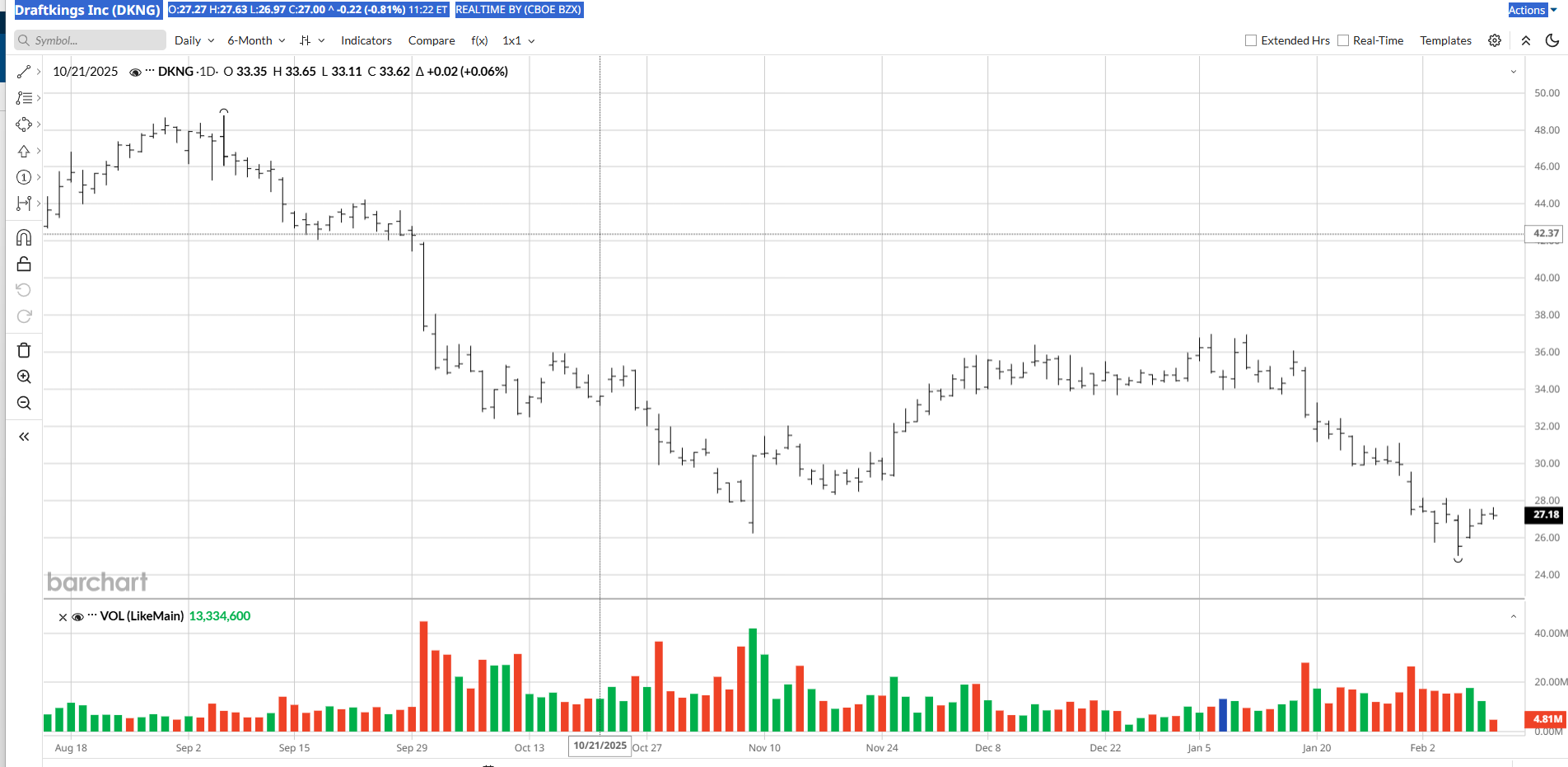 As of market close on Feb. 9, DKNG had tumbled 21% in 2026. During the same period, the S&P 500 Index ($SPX) had advanced 1.75%.