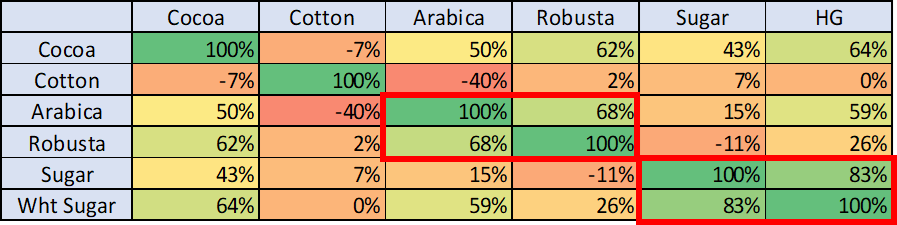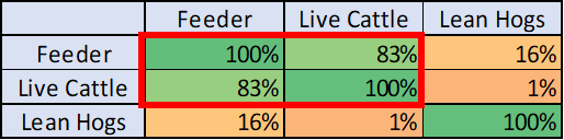 - Lean Hogs largely independent (1%–16% correlation)