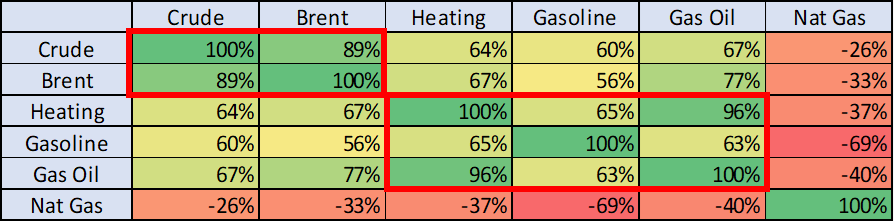 - Crude / Brent (~89% correlation)