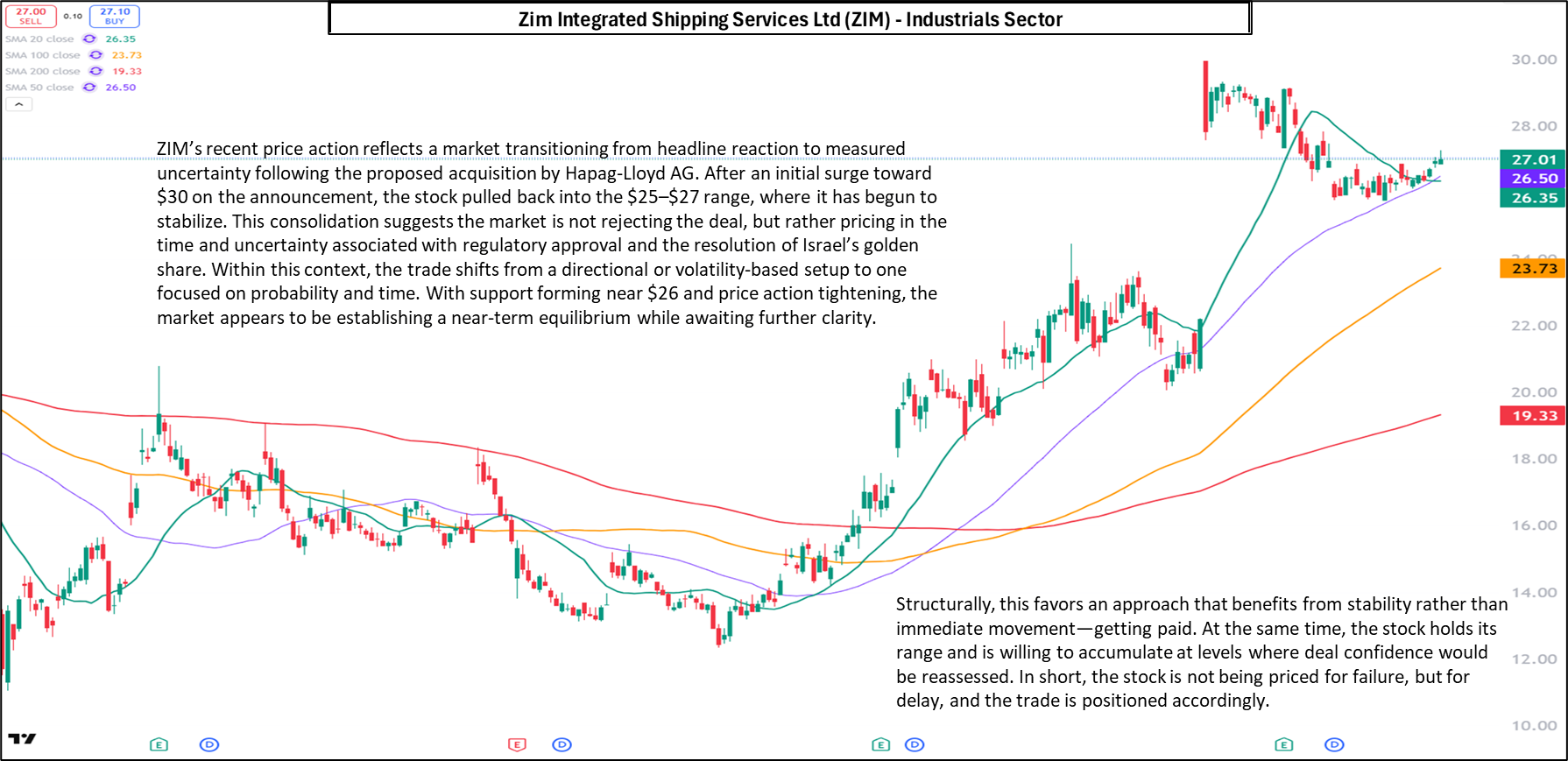 ZIM reflects a different type of opportunity—one driven by stabilization following a headline event. After the proposed acquisition by Hapag-Lloyd, with an indicated offer price of $35 per share, the stock surged toward $30 before pulling back into the $25–$27 range. Since then, price action has tightened, with support forming near $26. This behavior suggests the market is no longer reacting to the headline but instead pricing in time and uncertainty around the deal's completion.