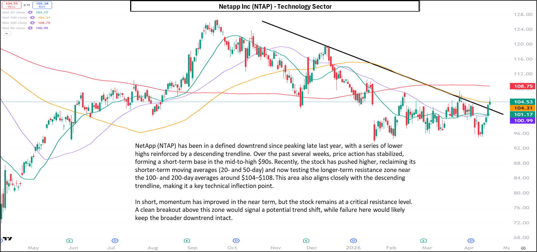 NetApp is a clean example of a stock approaching a key inflection point. After a prolonged downtrend defined by lower highs, the stock has stabilized and begun to recover, reclaiming its short-term moving averages. It is now pressing into a major resistance zone between roughly $104 and $108—an area defined by both the 100- and 200-day averages and a descending trendline.