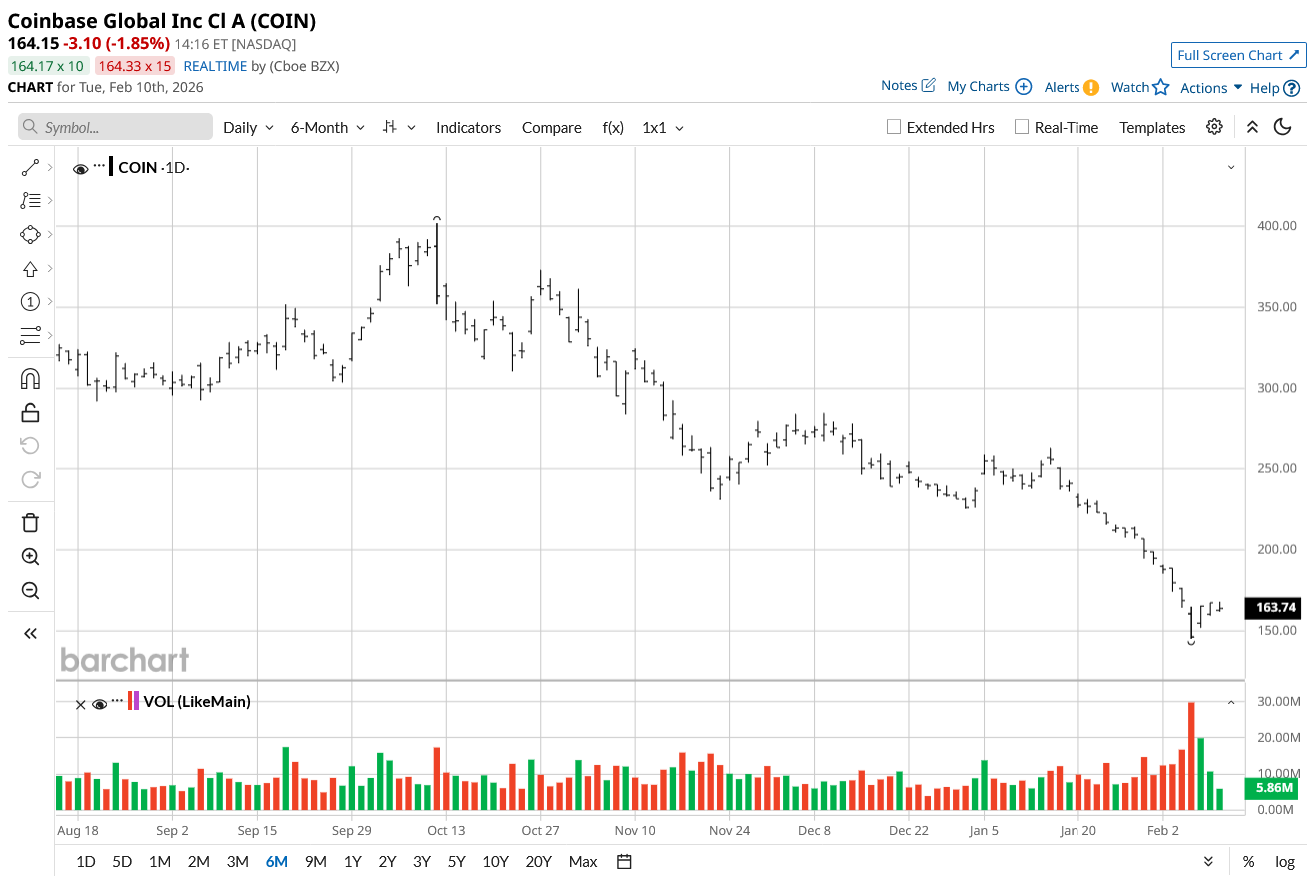 Coinbase's stock has plunged amid crypto volatility, tumbling 9% over the past five days and a steep 32% in the last month. It shed 48% over three months and 47% in six months, with year-to-date (YTD) losses at 28%. Over 52 weeks, shares are down 42% and 63% off the $444.64 high. Longer-term, two-year gains hold at 15% and three-year at 156%.