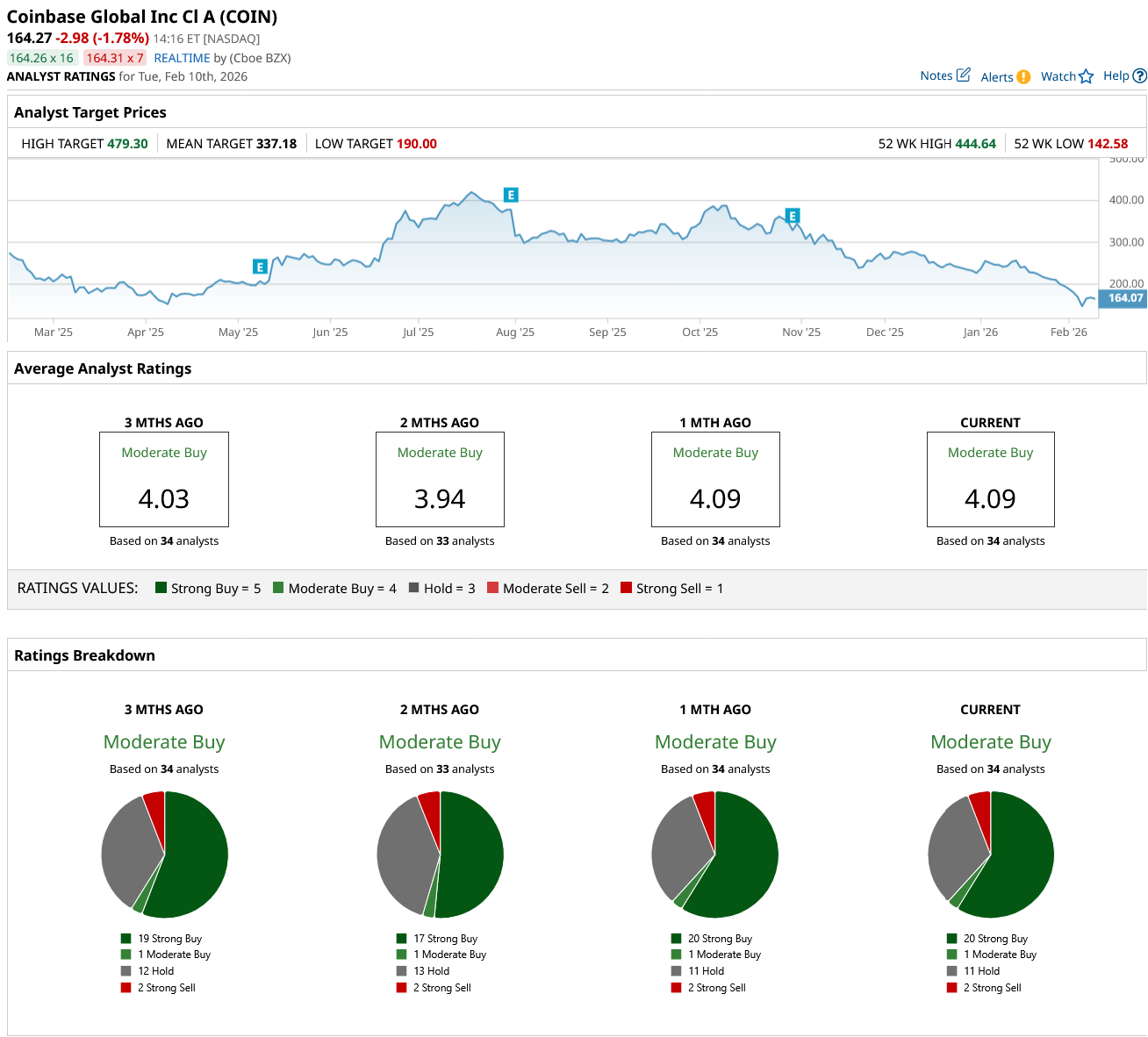 As crypto prices continue to fall, crypto stocks like Coinbase undergo a rough phase in the market, bleeding capital. Amidst this, the continued fall presents investors with an entry point, as analysts have given COIN stock a “Moderate Buy” rating with a mean price target of $337.18, signaling a high upside of 105% from the market rate.