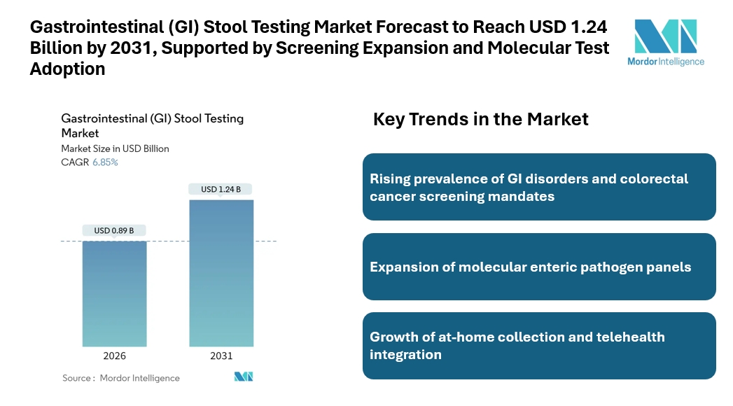 According to Mordor Intelligence, the gastrointestinal (GI) stool testing market size is estimated at USD 0.89 billion in 2026 and is expected to reach USD 1.24 billion by 2031, reflecting consistent expansion during the forecast period. This growth outlook highlights how stool-based diagnostics are becoming a routine part of disease screening, infection detection, and gastrointestinal disorder monitoring.
