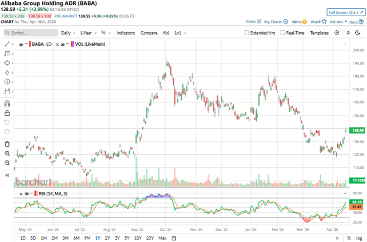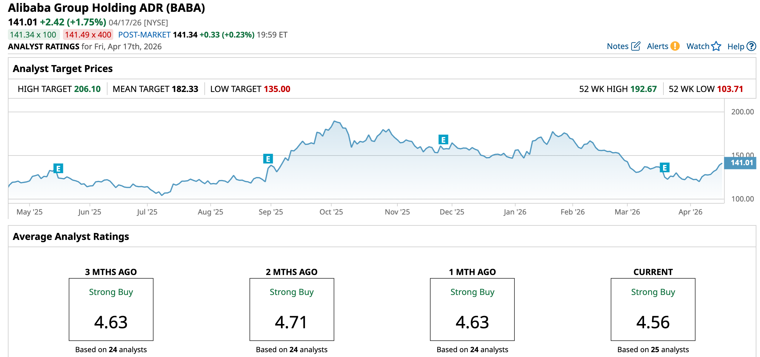 Alibaba’s stock has gained 29.52% over the past 52 weeks, but this year, it has dropped 3.8%. Investors seem worried about the company’s short-term profits, even though it continues to invest in AI and cloud and stays ahead of the competition in the Chinese e-commerce space. Alibaba’s shares had reached a 52-week high of $192.67 in October 2025, but are down 26.8% from that level.