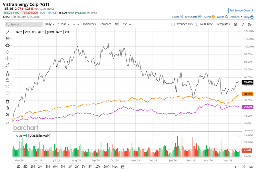VST stock has outperformed the S&P 500 Index’s ($SPX) 34.9% gains over the past 52 weeks, with shares up 41.6% during this period. Similarly, it outperformed the State Street Utilities Select Sector SPDR ETF’s (XLU) 18.7% gains over the same time frame.