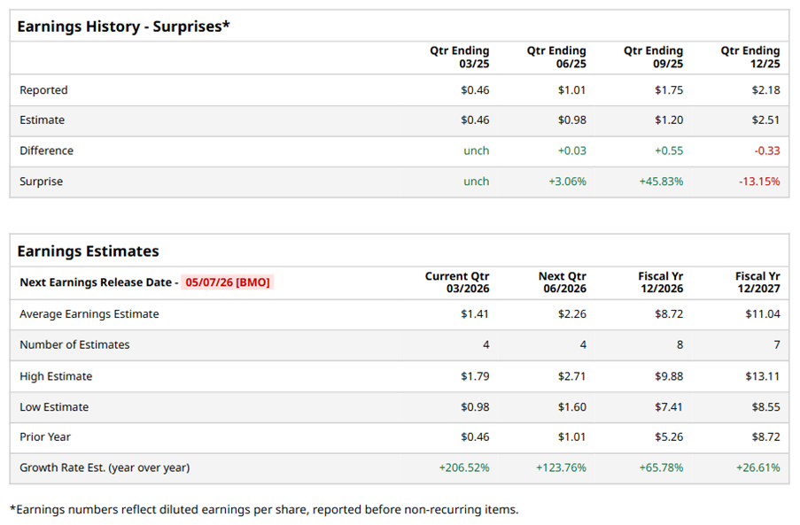 Irving, Texas-based Vistra Corp. (VST) operates as an integrated retail electricity and power generation company. With a market cap of $55.3 billion, the companyis also involved in wholesale energy purchases and sales, commodity risk management, fuel production, and fuel logistics management activities. The leading integrated retail electricity and power generation company is expected to announce its fiscal first-quarter earnings for 2026 before the market opens on Thursday, May 7.