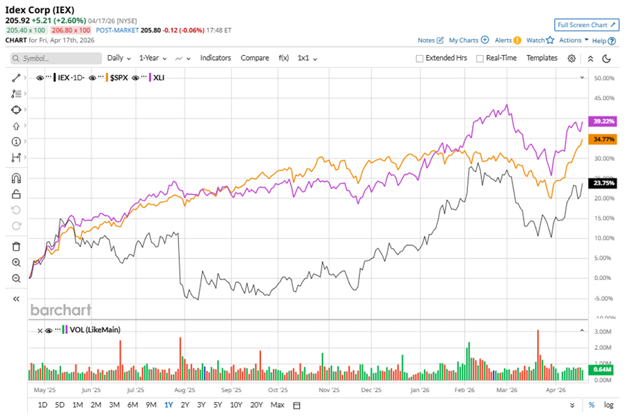 IEX stock has underperformed the S&P 500 Index’s ($SPX) 34.9% gains over the past 52 weeks, with shares up 25.6% during this period. Similarly, it underperformed the State Street Industrial Select Sector SPDR ETF’s (XLI) 38.5% gains over the same time frame.